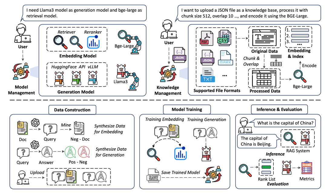 - 领域适应难:通用模型在特定领域(如法律条文检索)表现不佳,缺乏从数据构建到微调的一站式方案。