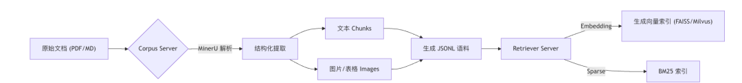 - 自动化语料构建:集成 MinerU,能够处理 PDF 中的复杂布局,自动提取文本、表格和图片,构建多模态知识库。