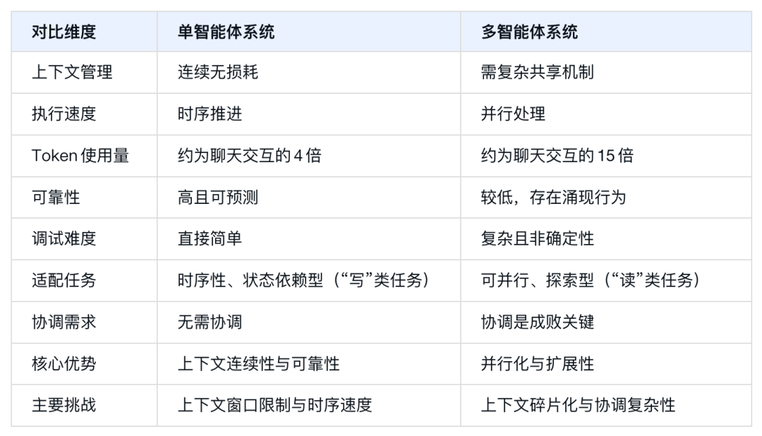 多智能体的核心优势在于:并行化探索多条路径以降低延迟,支持智能体专业化分工适配特定任务,能够应对复杂多维度的问题。但挑战也不容忽视:跨智能体上下文共享难度大,协调不当易导致重复劳动或决策冲突,token消耗更高。Anthropic的数据显示,其多智能体系统的token使用量是标准聊天交互的15倍。