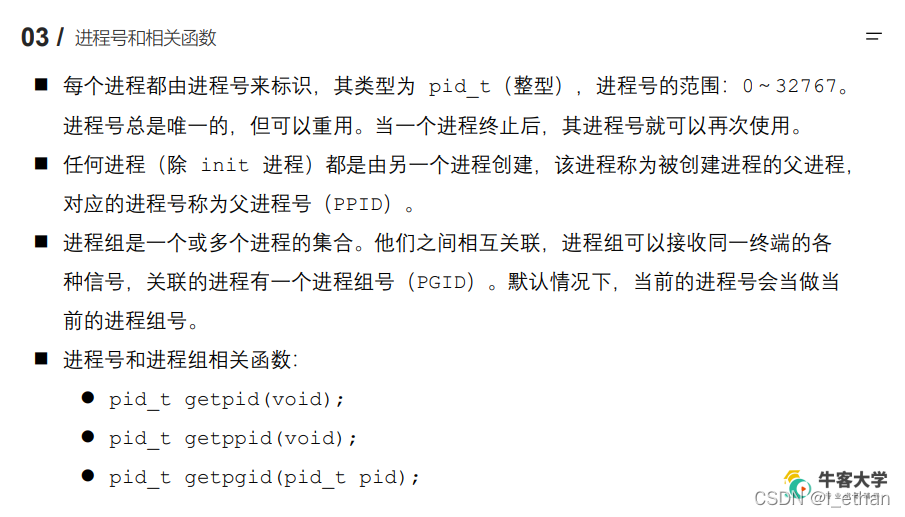 1.当前进程id 2.当前进程父进程id 3.获取进程进程组id (如果括号内是null就是当前进程,如果括号内是进程号就是指定进程号对应的进程组id)