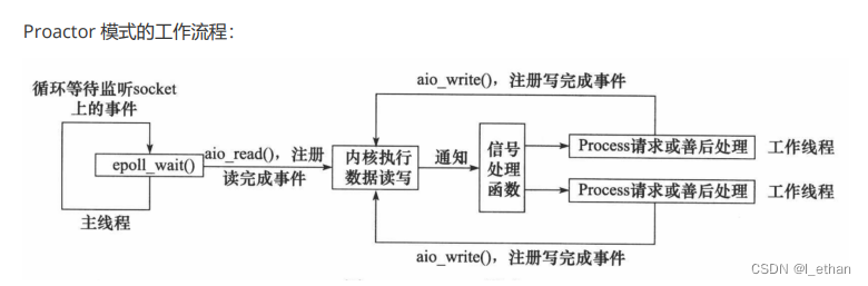 Proactor 模式将所有 I/O 操作都交给主线程和内核来处理(进行读、写),工作线程仅负责业务逻 辑。使用异步 I/O 模型(以 aio_read 和 aio_write 为例)实现的 Proactor 模式的工作流程是: