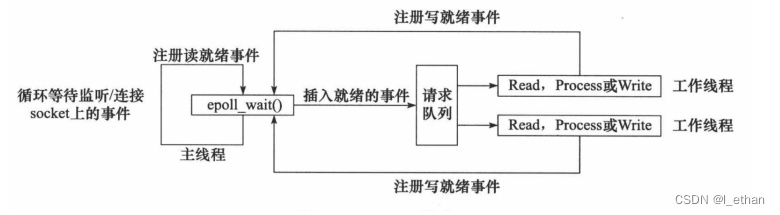3. 当 socket 上有数据可读时,epoll_wait 通知主线程。主线程从 socket 循环读取数据,直到没有更 多数据可读,然后将读取到的数据封装成一个请求对象并插入请求队列。