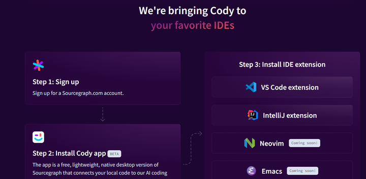 第三步是安装Cody的IDE插件,目前它支持VS Code和IntelliJ旗下的开发工具。