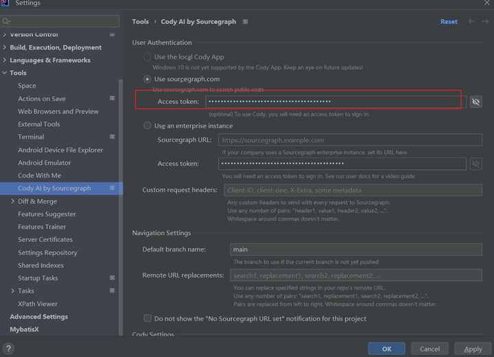 下面介绍一下通过Access tokens授权,以IDEA为例,安装后找到Cody的设置如下: