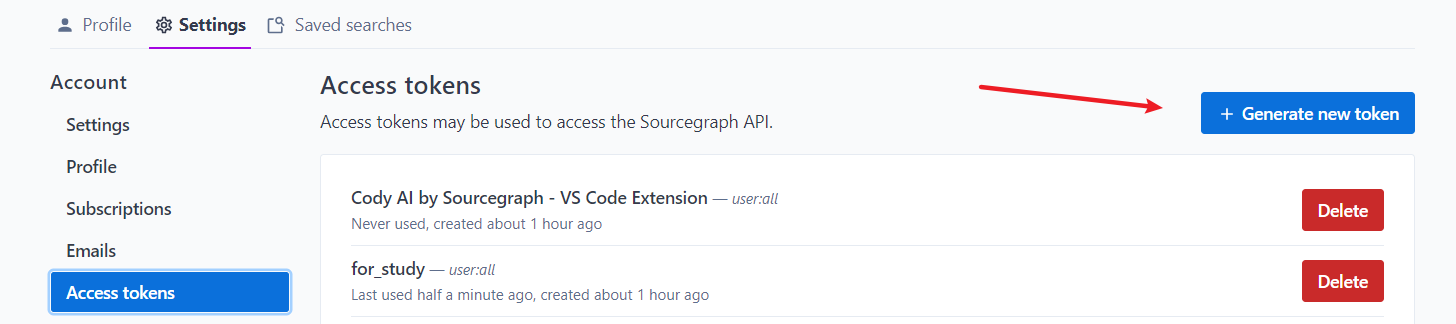 然后点击创建新的token密钥,创建好记得复制出来,页面关掉后就不能第二次看这个token了,只能删除或者新增。把复制出来的token保存到IDEA的cody设置里,然后就可以使用了。