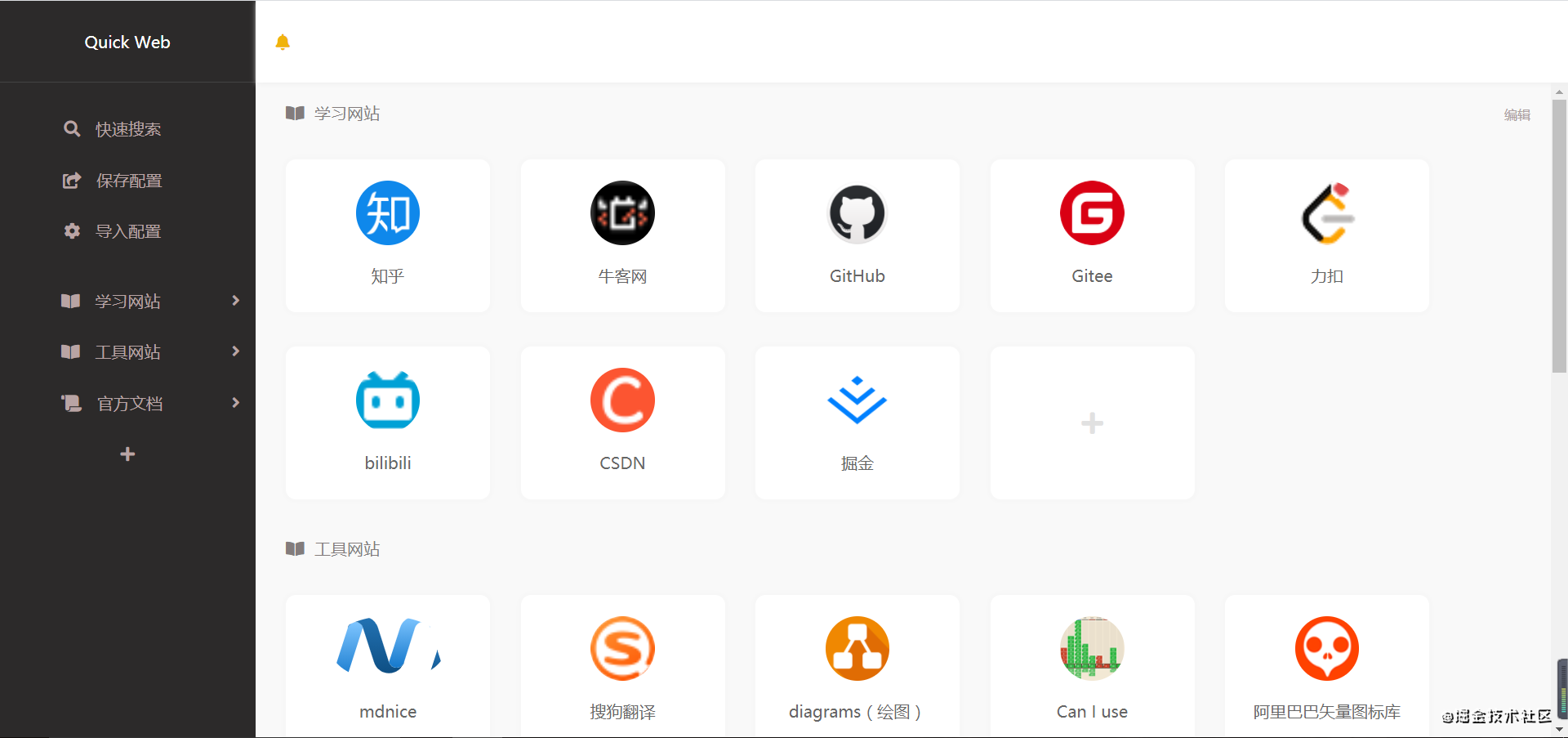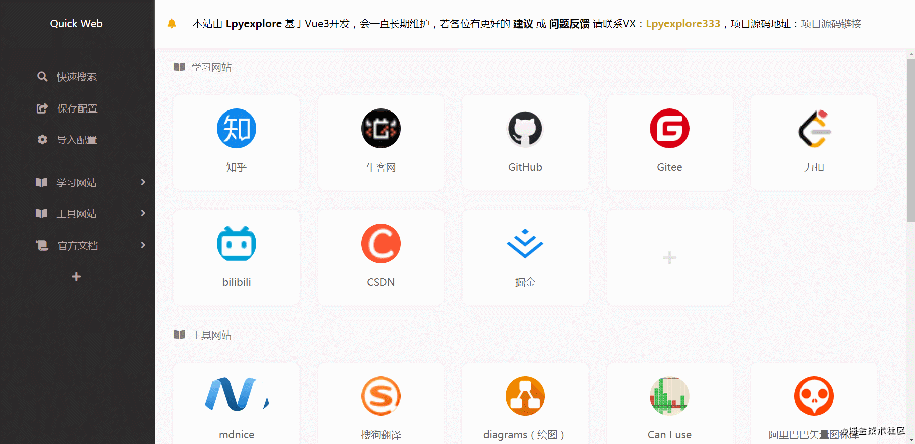 有些小伙伴问,为啥不做一个账号登录的网址导航栏,这样到哪都不用带着配置文件了,只需要记住账号密码就可以了。我又要强调本项目的选择了,能不用服务器就不用服务器,能不用数据库就不用数据库,用你自己的本地的 localStorage 作为数据库存储,你不是更放心嘛,比如你收藏了一些奇奇怪怪的网站,反正就只有你知道,我反正肯定是不知道的 😏 而且细心的小伙伴有没有发现,我连静态页面都不是用的自己的服务器,直接部署在码云上的