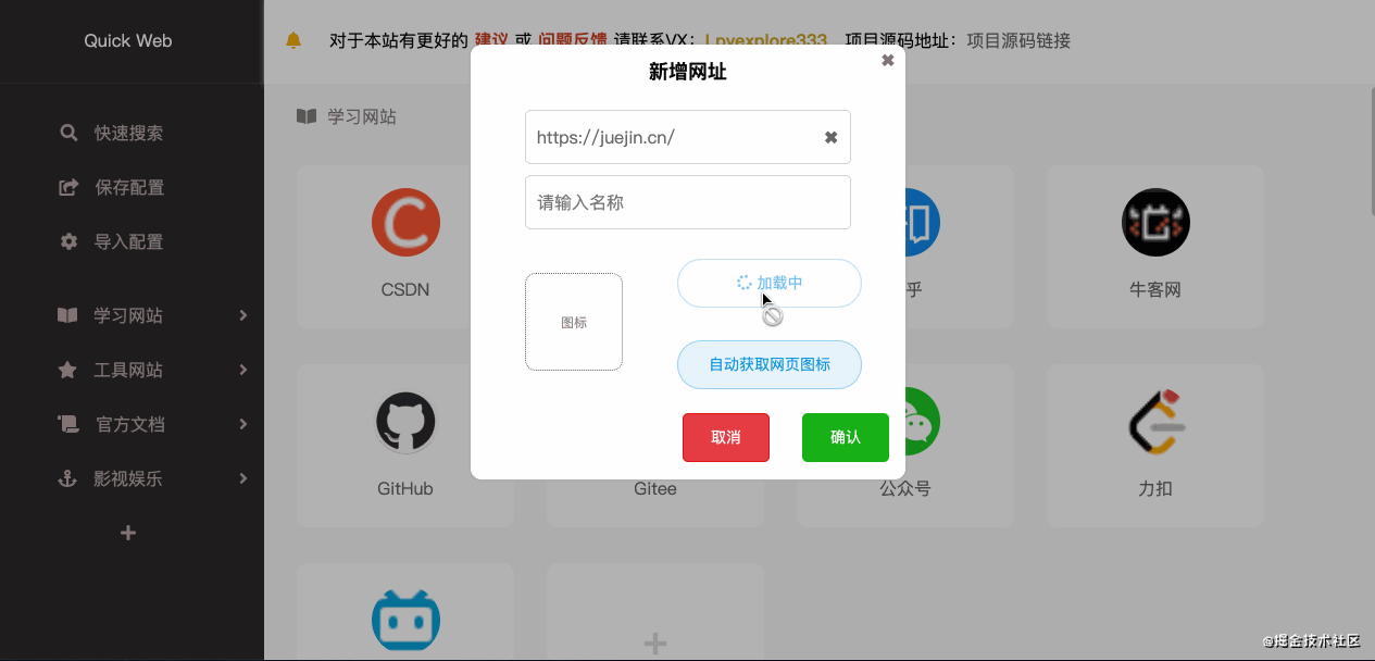 第三个功能就是为了针对那些无法获取 icon 的网站导致我们导航栏中显示的图标为默认图标,比较丑,所以到时候可以支持大家自行选择喜欢的图标