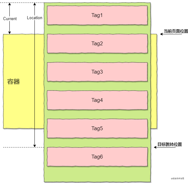 实现原理大概是这样:右侧内容中每个标签都有带有一个 id,并且左侧的每个按钮也是对应着各自的 id 的,所以当点击了按钮时,先获取到对应 id 的元素 el,并获取 el 离滚动页面顶部的距离,即 el.scrollTop,然后同时获取一下当前位置离滚动页面离顶部的距离,如下图所示: