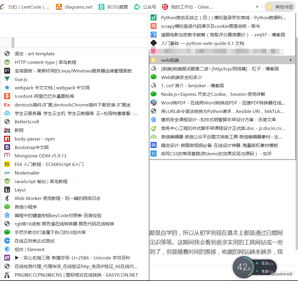 我现在也是个非计算机专业的大四在校生,平时前端都是自学的,所以从初学到现在基本上都是通过白嫖网上的视频、买书或从图书馆借书看、逛技术博客长长见识等等。这期间我会看到很多实用的工具网站或一些有趣的网站,我都会把他们收藏下来,生怕之后找不到了,但是随着时间的推移,收藏的网站越来越多,我的浏览器收藏夹可能变成了这样