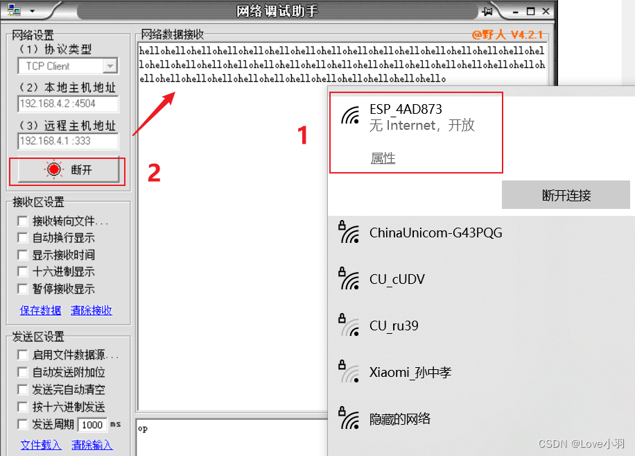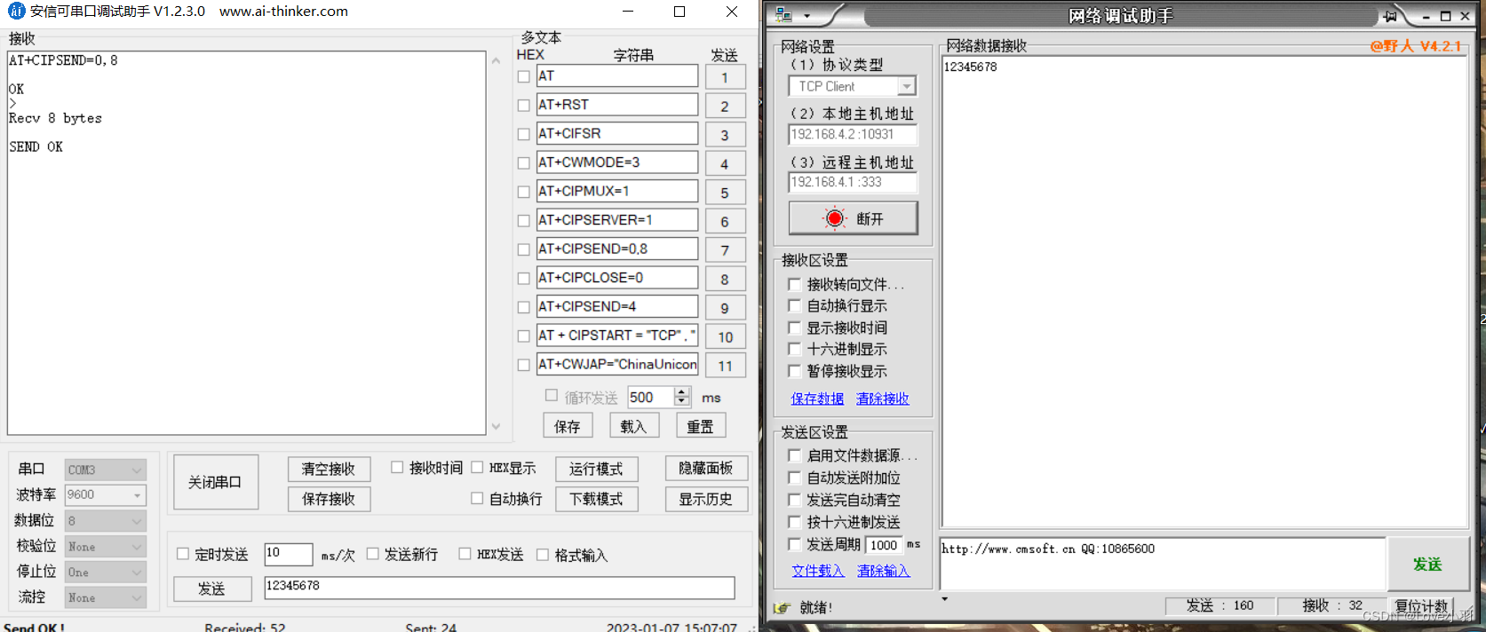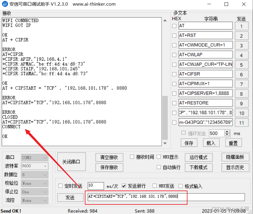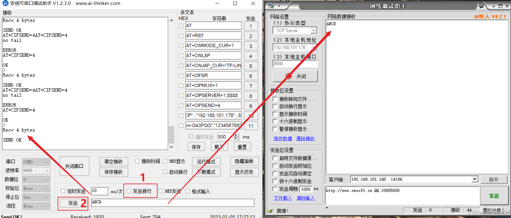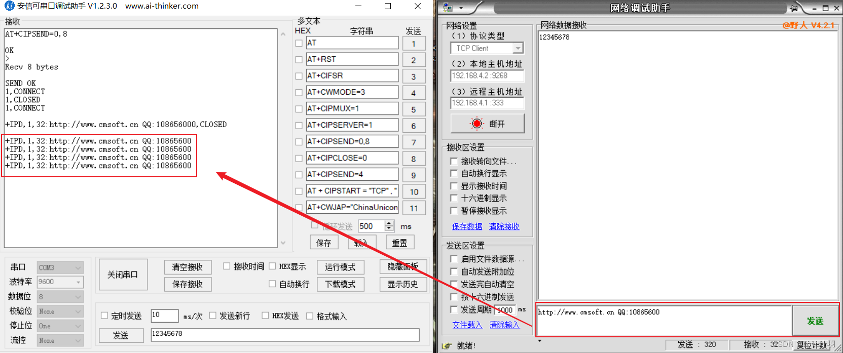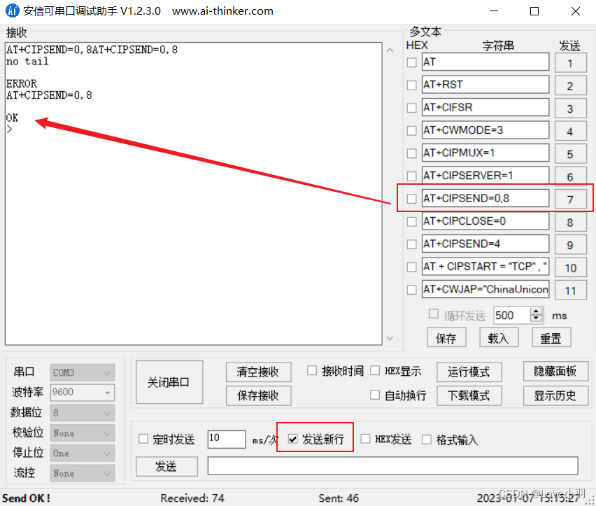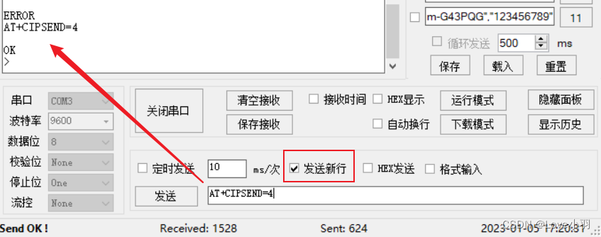 // 注意,这种情况下,每次发送前都要先发送 AT+CIPSEND= 长度 的指令,再发数据注意:输入发送数据命令时,要勾选"发送新行",当真正发送数据时,要取消"发送新行"的勾选
