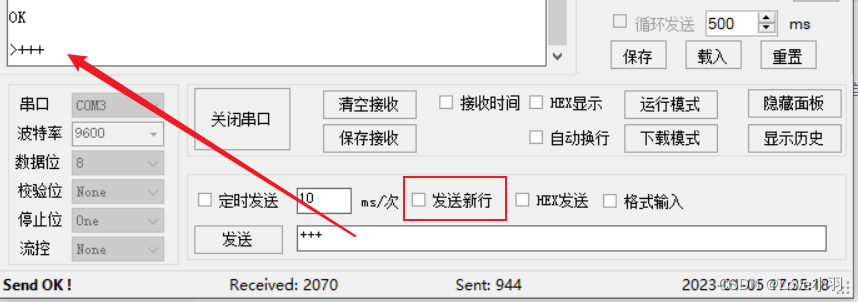注意:输入发送数据命令时,要勾选"发送新行",当真正发送数据时,要取消"发送新行"的勾选