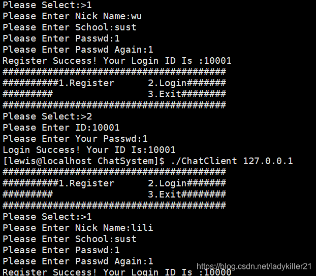 这里我要提一句为了确保安全性,我在注册和登陆的时候选用的是TCP协议进行通信,而在聊天阶段,为了数据的方便接收退而求其次使用了UDP协议进行通信