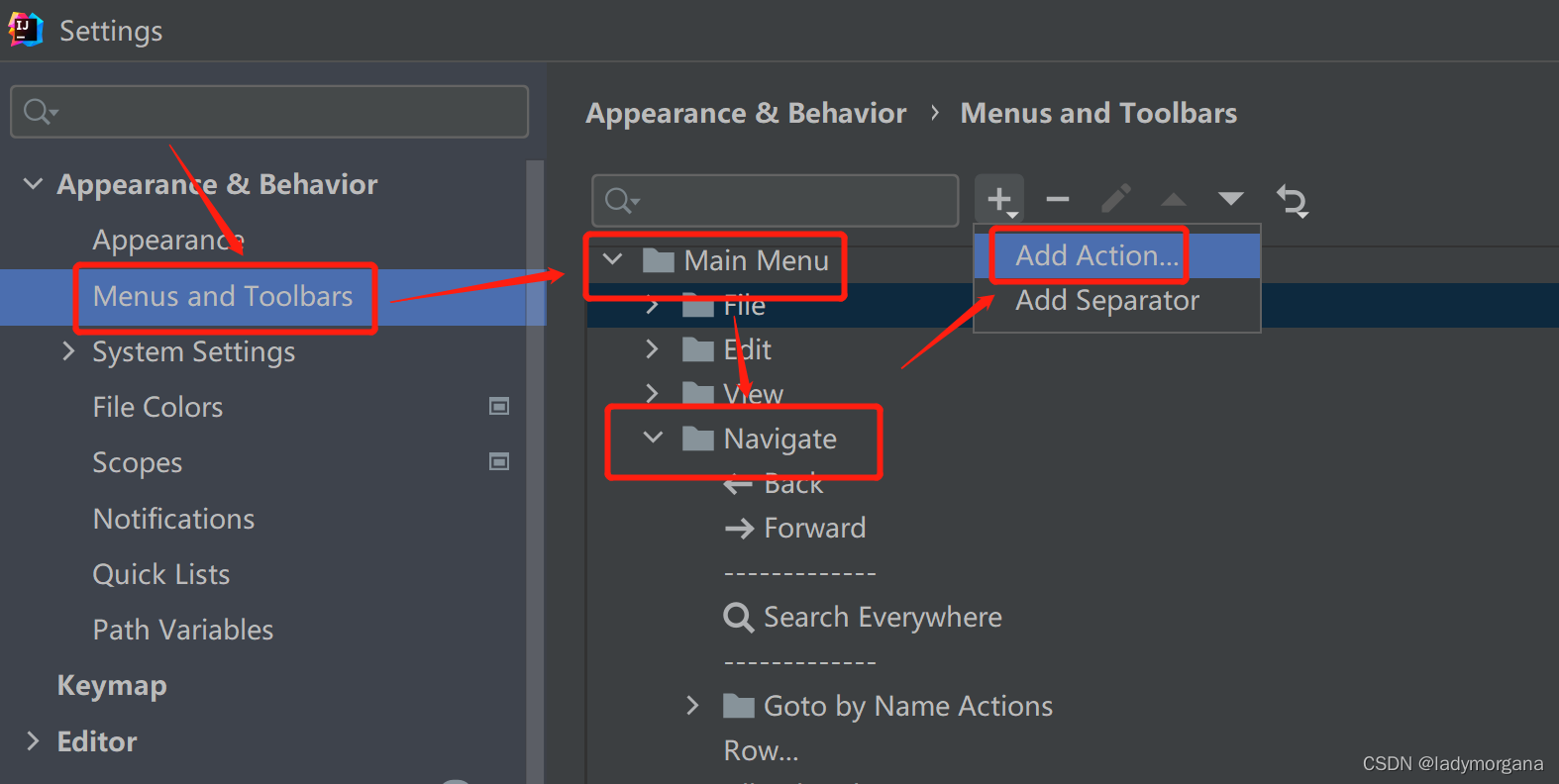 有的版本是改这里 File --> Menus and Toolbars --> Main Menu --> Navigate--> Add Action