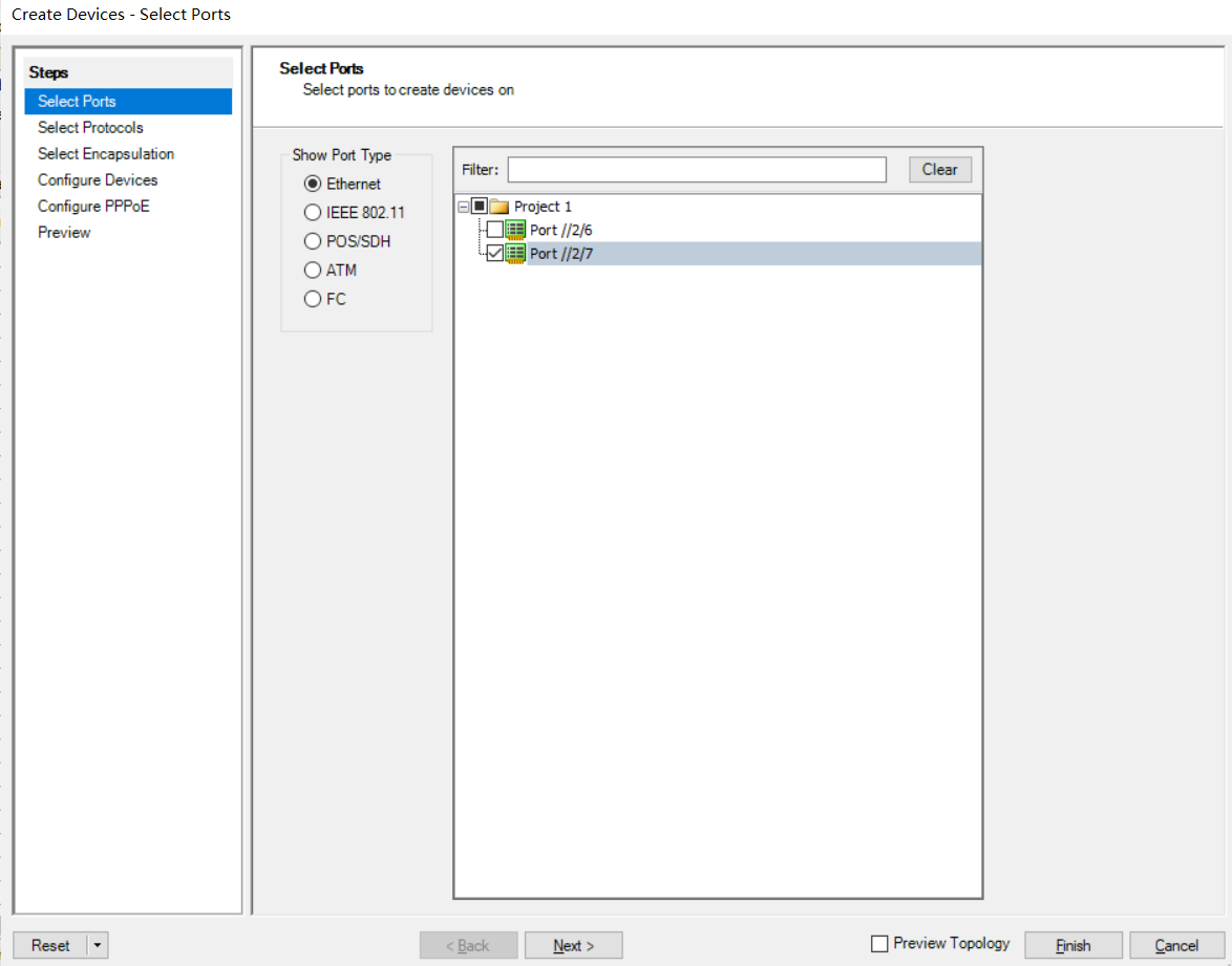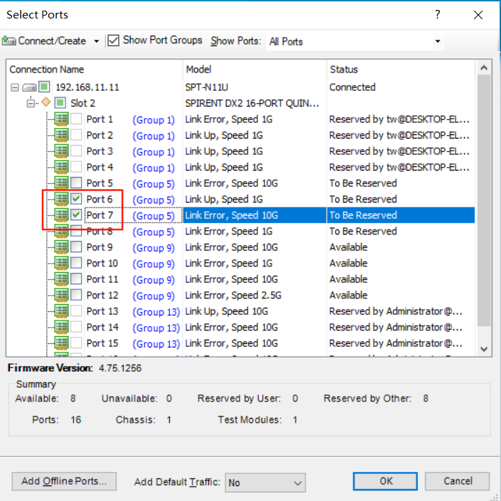 3、勾选测试用的接口,如下Port6和Port7,其中Port6作为PPPOE服务器接口,Port7作为LAN device接口