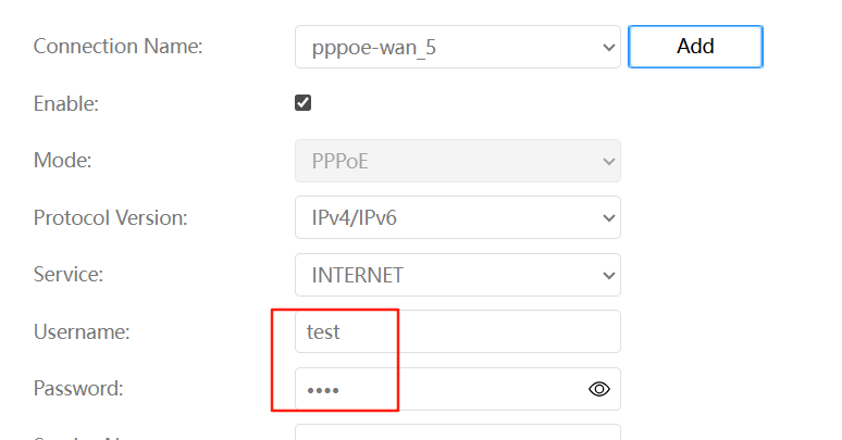 1、在路由器新建一个PPPOE WAN连接,输入账号密码test\test