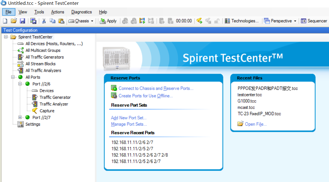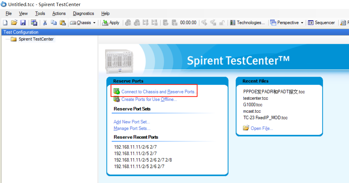 2、打开test center管理客户端,点击【Connect to Chassis and Reserve Ports】,连上TestedCenter机框