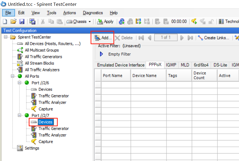 在Port7建立LAN Device模拟LAN侧的终端,与Port6上的PPPOE服务器之间互相发数据流