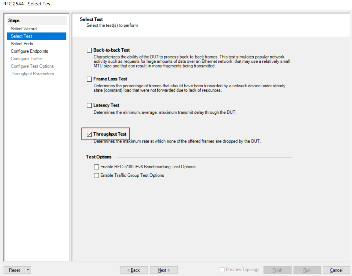 3、RFC2544 包含吞吐性能测试、延时测试等等,勾选【Throughput Test】,选择吞吐性能测试