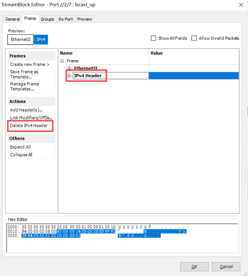在【Frame】页面选中IPv4报头,然后点击【Delete IPv4 Header】