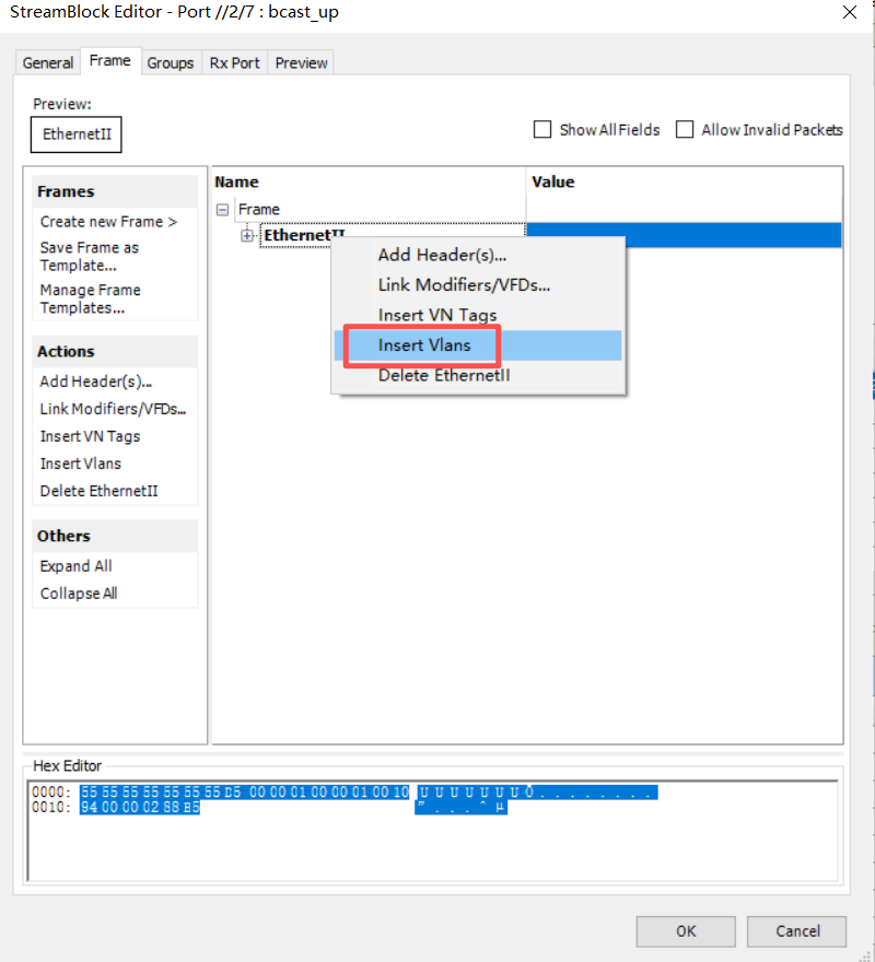 4、右键以太网帧头,选择【Insert Vlans】,插入vlan字段;