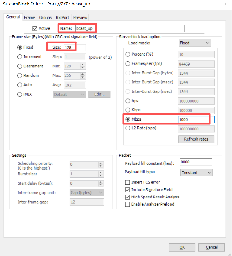 2、在【General】页面,修改流名称为“bcast_up”,修改发流方式为固定1000Mbps,其他参数保持默认即可