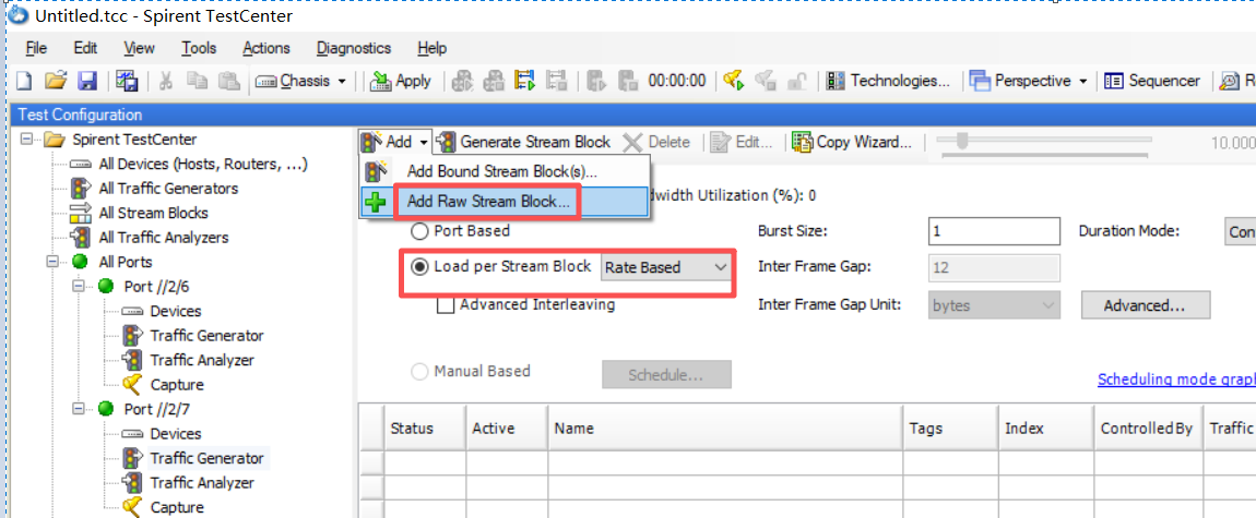 1、点击Port7下的【Traffic generator】,勾选【Load per Stream Block】设成按流任务的负载发流,然后点击【Add】按钮,选择【Add Raw Stream Block】