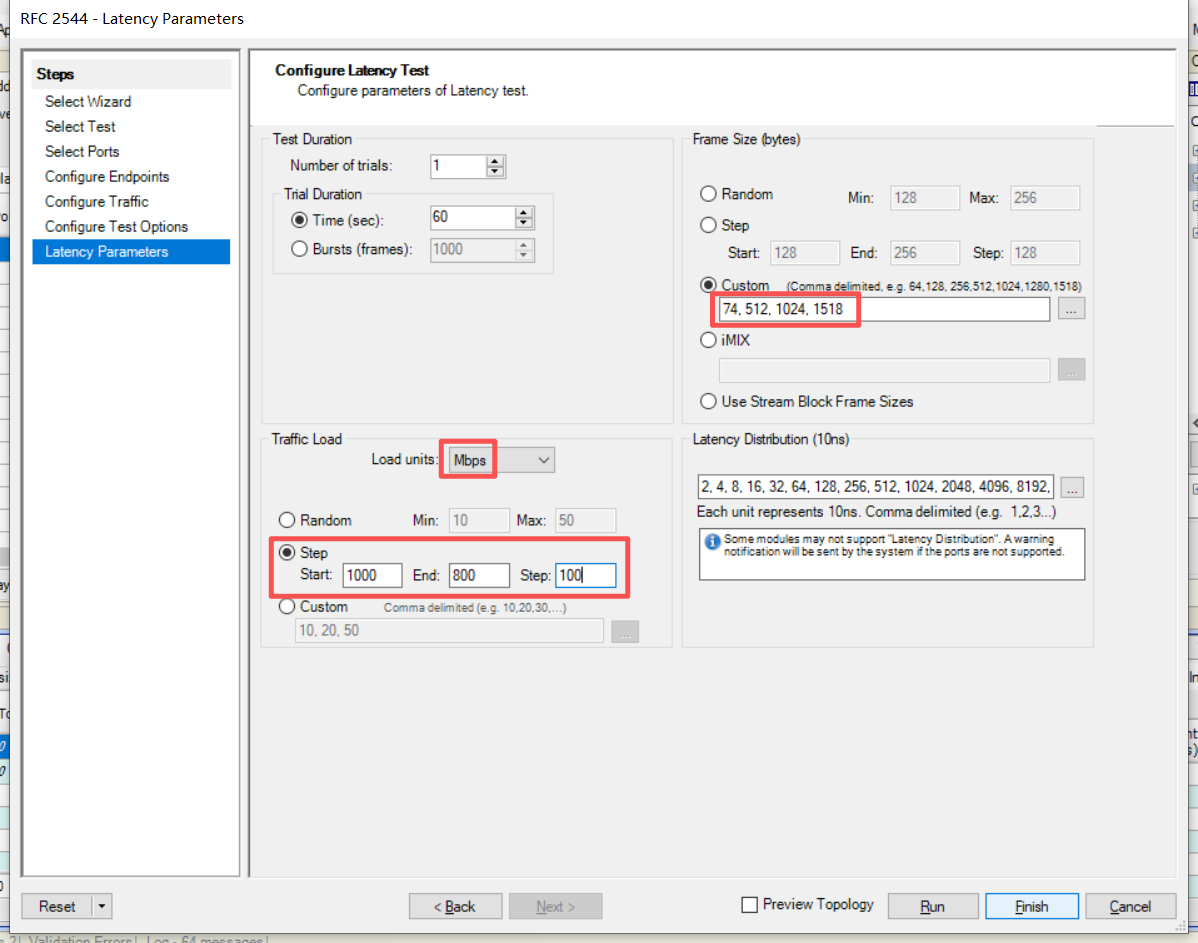 Step:按步进方式测试;Start 1000,End 800,Step 100,表示从1000Mbps(Mbps是因为Load Unit设置成Mbps)开始测到800Mbps,步进值是100Mbps,即测试1000Mbps、900Mbps、800Mbps;