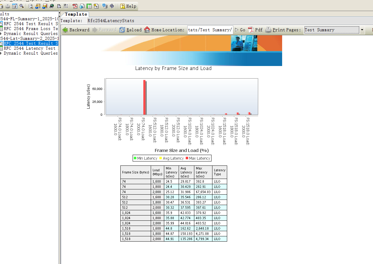 在此页面可以查看TestCenter的RFC2544丢包率的正式报告,可以查看每个字节的丢包率,并可以导出pdf格式的报告
