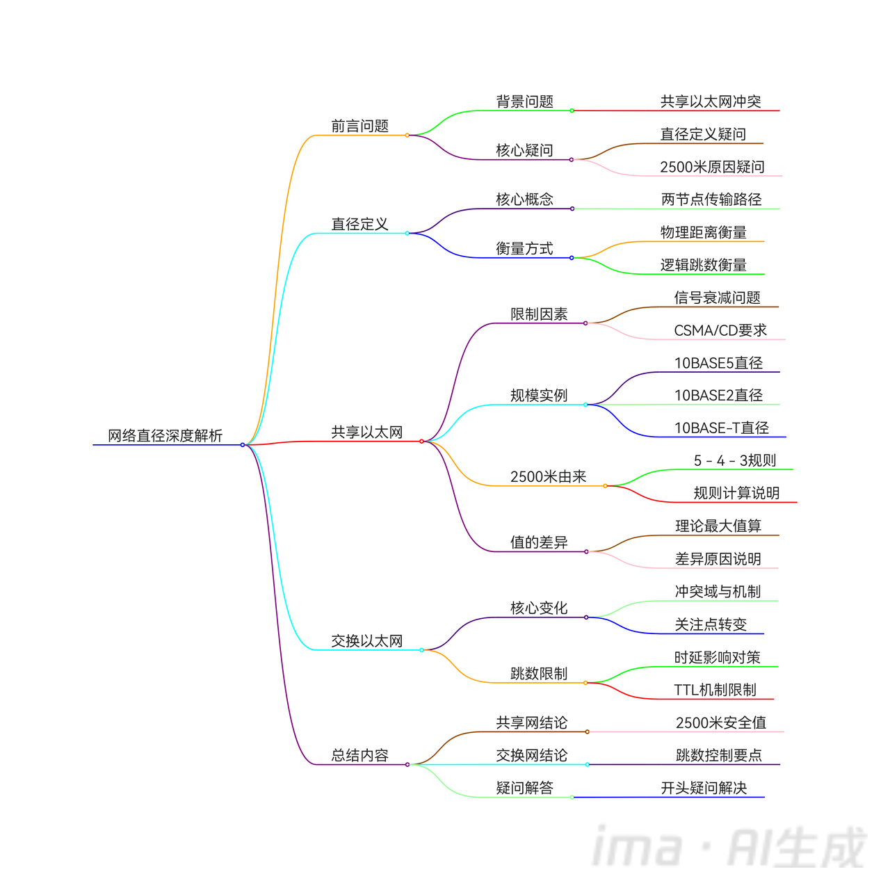 总的来说,以太网的"网络直径"指网络中任意两节点间最长路径的距离或跳数,早期的共享式以太网中理论值最大可以达到5120米,不过为了确保网络在任何情况下都安全运行,最大网络直径被限制为2500米。在现代的交换以太网中,因时延和TTL限制更关注跳数,工程师需要通过精心的网络规划控制网络直径。至此,开头的两个疑问都得到解答。