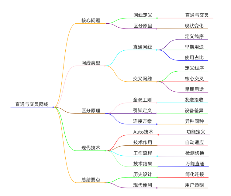 交叉网线指的是网线一端的线序为T568B,另一端的线序为T568A,其核心是将1和3号线、2和6号线进行交叉。交叉网线的一端(T568B)线序是白橙、橙、白绿、蓝、白蓝、绿、白棕、棕,另一端(T568A)线序是白绿、绿、白橙、蓝、白蓝、橙、白棕、棕。T568B端的第1根线(白橙)对应T568A端的第3根线(白绿),T568B端的第2根线(橙)对应T568A端的第6根线(绿)。在以太网早期,主要用于连接相同类型的设备,如交换机连接交换机。