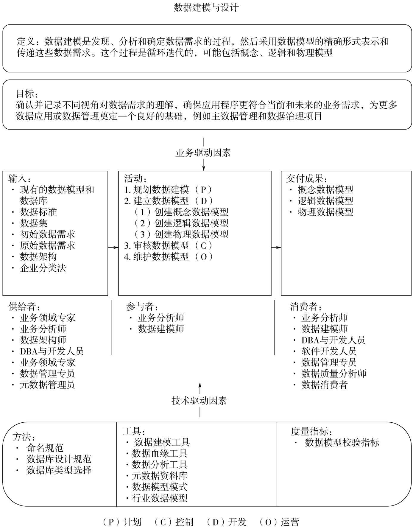 数据常用关系模式、多维模式、面向对象模式、事实模式、时间序列模式和NoSQL模式表示,每种模式有3层模型(概念模型、逻辑模型和物理模型)。每种模型需要质量审核、批准和维护。