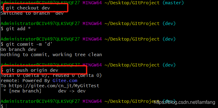 git checkout是切换分支,git push origin dev其中,跟在origin后面的dev你刚刚切换的分支的名字,提交上去后,远程仓库会自动创建一个同名的分支。
