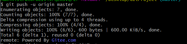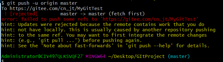 这里出现了错误,什么错误呢?就是码云的那个远程仓库包含有本地仓库没有的文件(码云仓库在新建时一般会有一个README.md文件)。