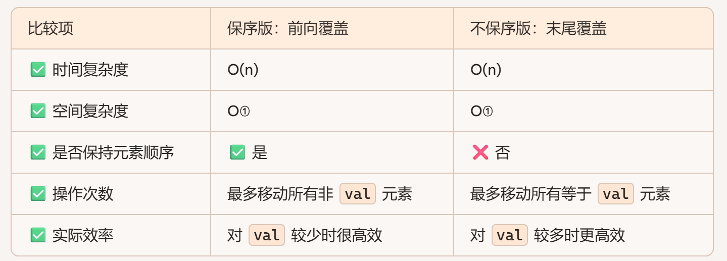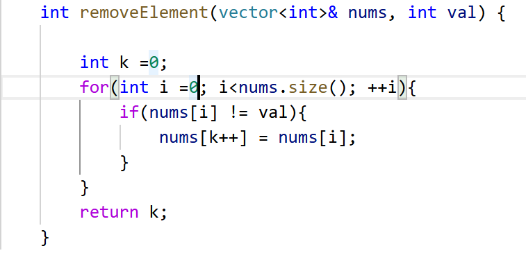 1.双指针从头部出发,对 nums[i] !=val 进行判断,若true,则将nums[i]覆写到nums[k++]上,完成整个数组的遍历移除元素。