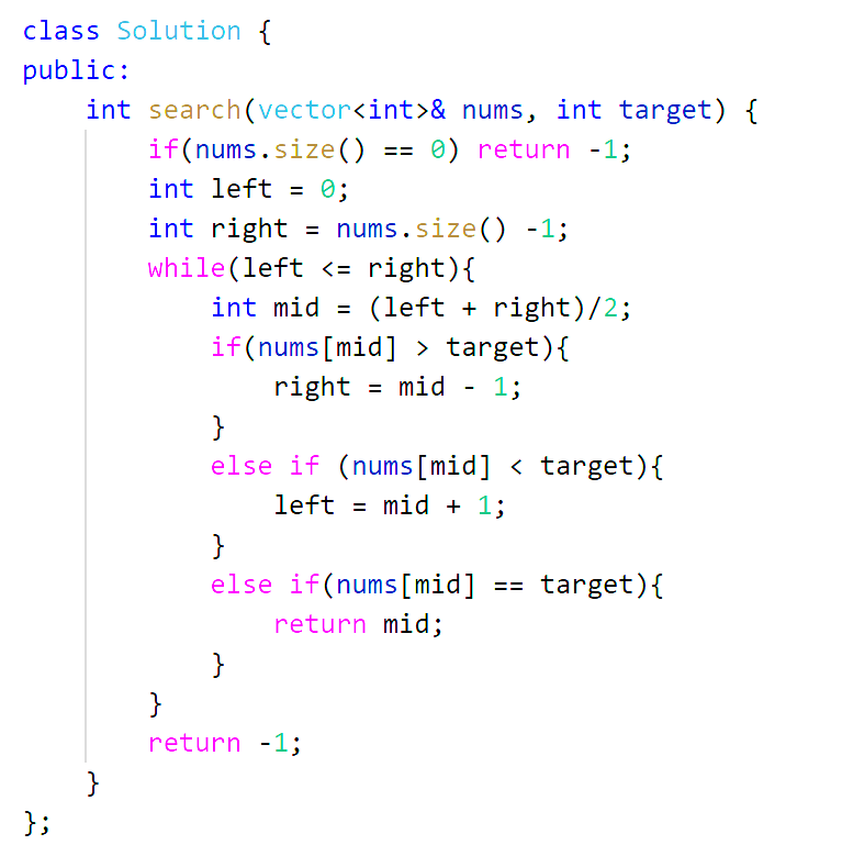 if(nums[mid] > target){right = mid - 1;} if (nums[mid] < target) {left = mid + 1;}