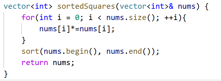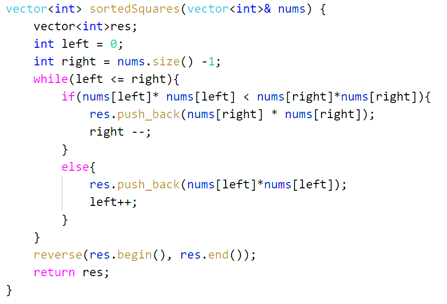 解法:头尾指针:根据题意可知难点主要考虑负数情况,所以最大值一般出现在头尾两侧,并且这种情况会依次循环,故选择头尾指针法依次比较,写出递减数组之后再reverse数组就可以解出。