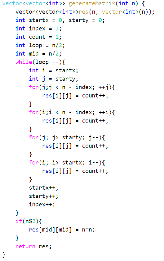 同时,每次循环的初始位置也会由于上一次循环的圈被占用而更改,故存在startx = 0, starty = 0;在每次循环后都++;