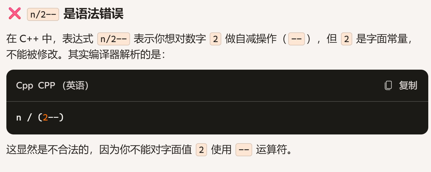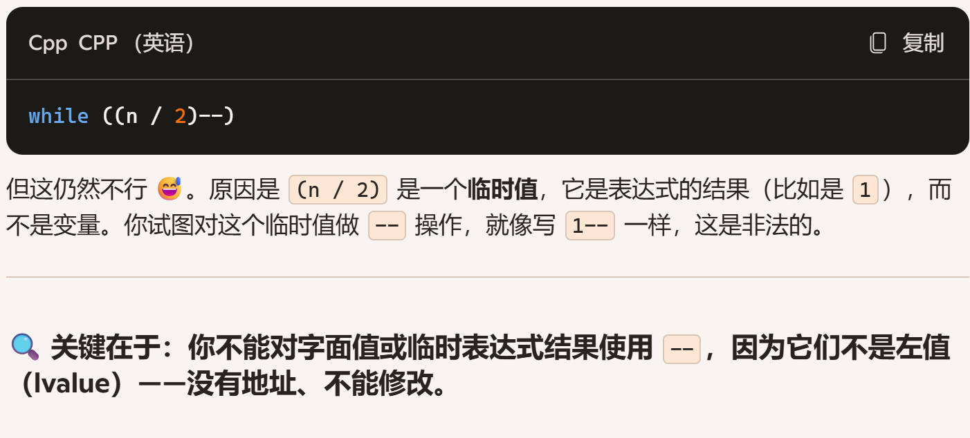 while(loop --) 想少定义loop变量,写成while(n/2 --)和while((n/2)--)都是语法错误编程,原因如下: