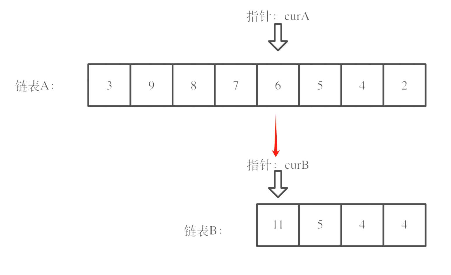 思想是让两个链表尾部对齐,然后从短链表头部和长链表中部开始一一比对,存在一样即存在相交。