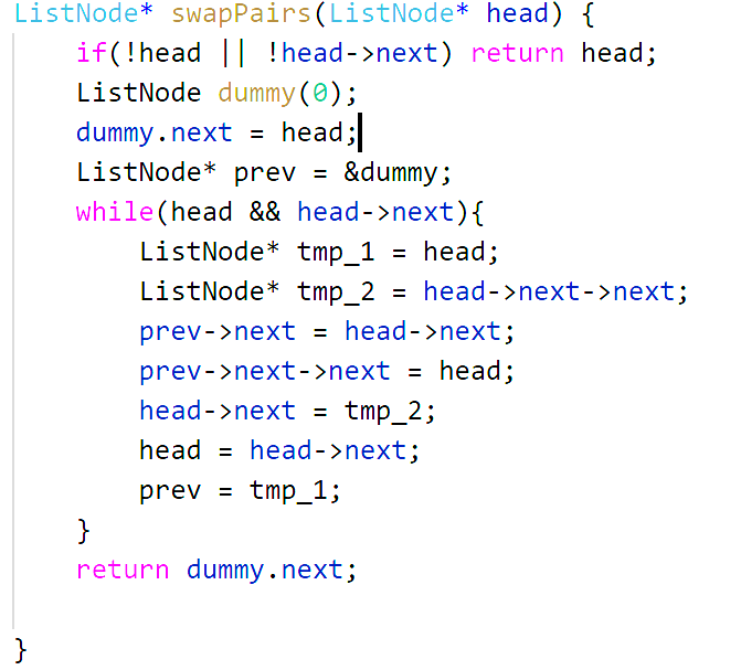 重点还是之后如何循环这个过程,之前总是脑子不清楚,现在是将反转后的后一个节点看成新的dummy然后重复上述过程,所以只需要让prev指向之前的head就可以了。