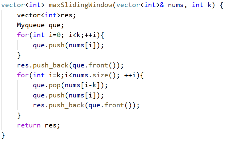 定义自己的单调队列Myqueue 来保持滑动窗口的潜在最大值们,所以需要记录单调递减的数值序列;