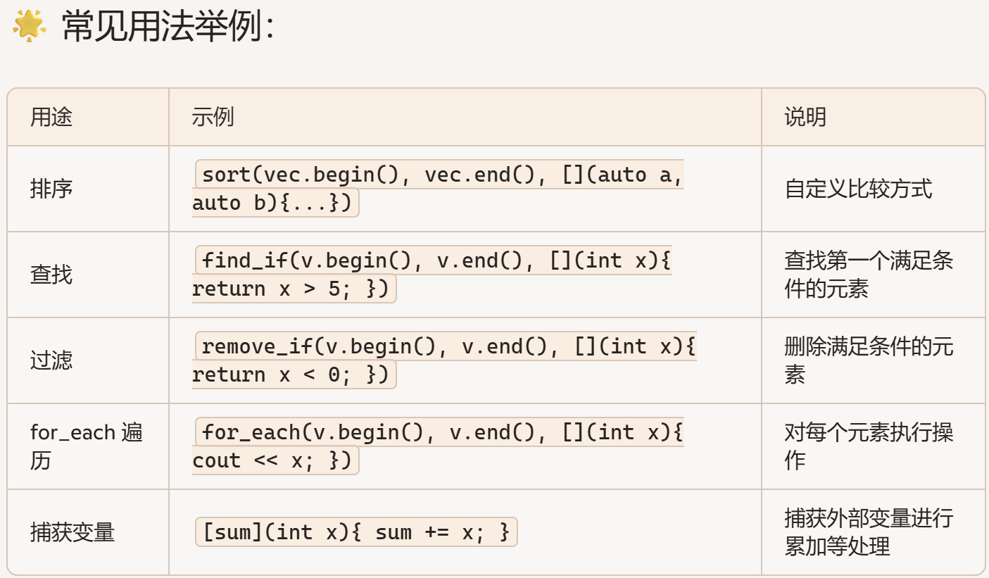 也叫 匿名函数。它在 C++11 中引入,是一种无需事先命名函数即可在需要的地方定义函数逻辑的方式,非常适合像排序、过滤、回调等场景。