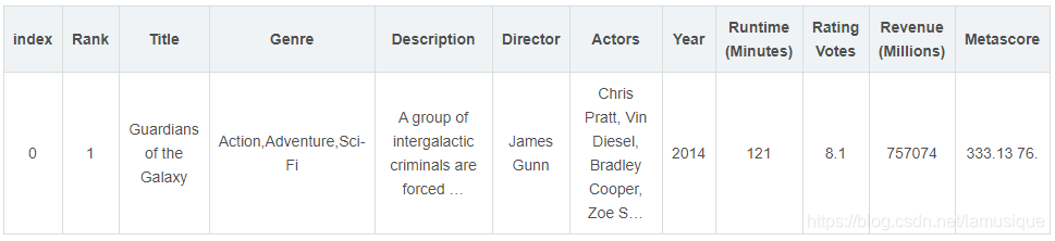 对于获取到的数据,总会有一些是缺少的,如果这些缺少的数据对于我们的接下来的工作无关紧要,就可以直接舍弃;而有作用的就要应该补齐。我们使用一些电影数据来说明接下来的操作,先看看电影数据的结构