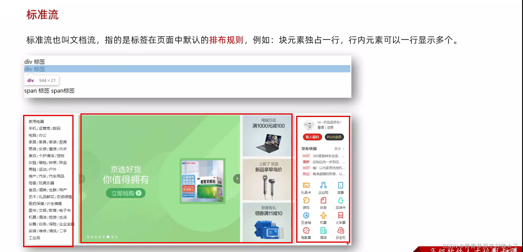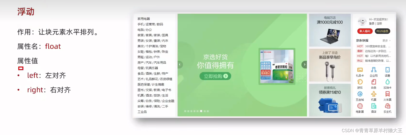 具备顶对齐,行内块显示特点,浮动的盒子是脱离了标准流。