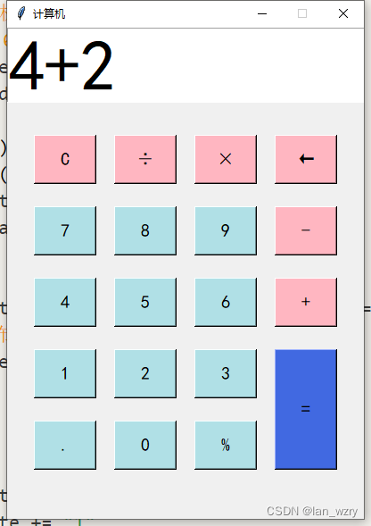 btni = Button(root, text='=', font=('黑体', 15), width=6, height=6, bg='RoyalBlue', command=equal)