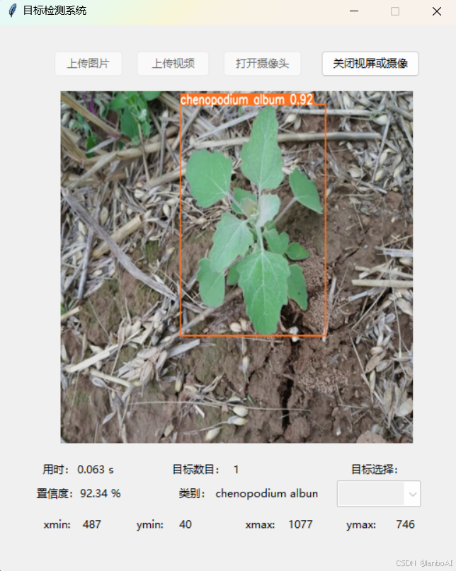 基于yolov8的农作物杂草检测识别系统是在 PyTorch 框架之下得以实现的。这是一个完备的项目,涵盖了诸多方面,其中包括代码部分,精心整理的数据集,训练完备的模型权重,详实的模型训练记录,直观友好的 UI 界面以及各类重要的模型指标(如准确率、精确率、召回率等等)。