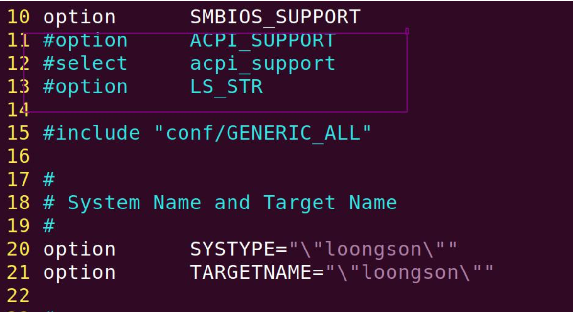 PMON下选择是否使用ACPI传参配置的文件路径: Targets/ls2k2000/conf/ls.2k2000( 2k2000中不同的板卡型号具有不同的配置文件, 例如有ls_pai.2k2000,ls_nuc.2k2000, 在使用时需要复制成ls.2k2000) 。