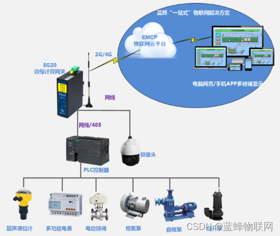 了解企业需求后,我们建议客户使用蓝蜂物联网的EMCP物联网云平台,结合蓝蜂EG20型号边缘计算网关,通过云平台的监控功能,配合EG20系列网关的强大脚本处理功能,能够按照客户的要求,构建一套排水设备远程监控和大数据统计系统