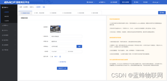2. 使用企业管理员账号登录EMCP平台,进入设备中心>>设备管理功能,进行创建设备操作,创建过程中,可根据客户需求灵活进行驱动配置,变量配置,历史报表配置,脚本配置,对设备建立一套完整的物模型,用于实现设备远程监控和管理的基础