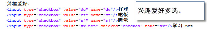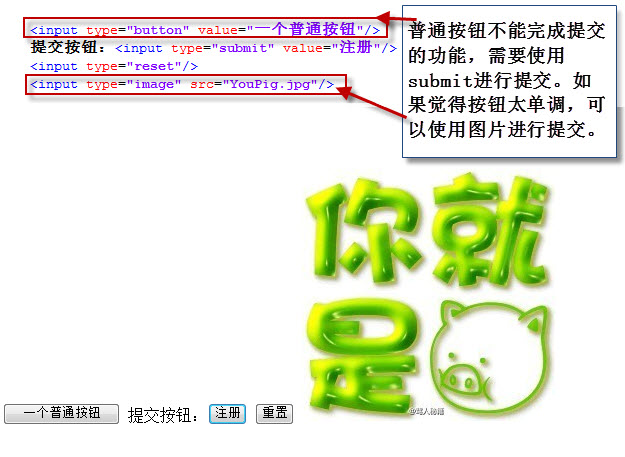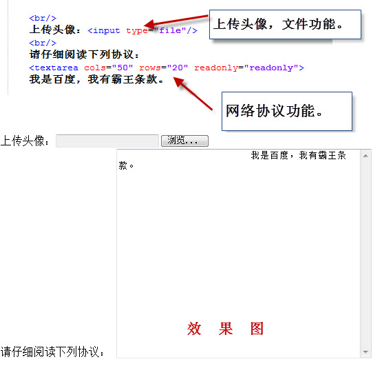 <input>是主要的表单元素,type的可选值:submit(提交按钮)、button(普通按钮)、checkbox(复选框)、file(文件选择框)、hidden(隐藏字段)、image(图片按钮)、password(密码框)、radio(单选按钮)、reset(重置按钮)、text(文本框)。<input type="file" />